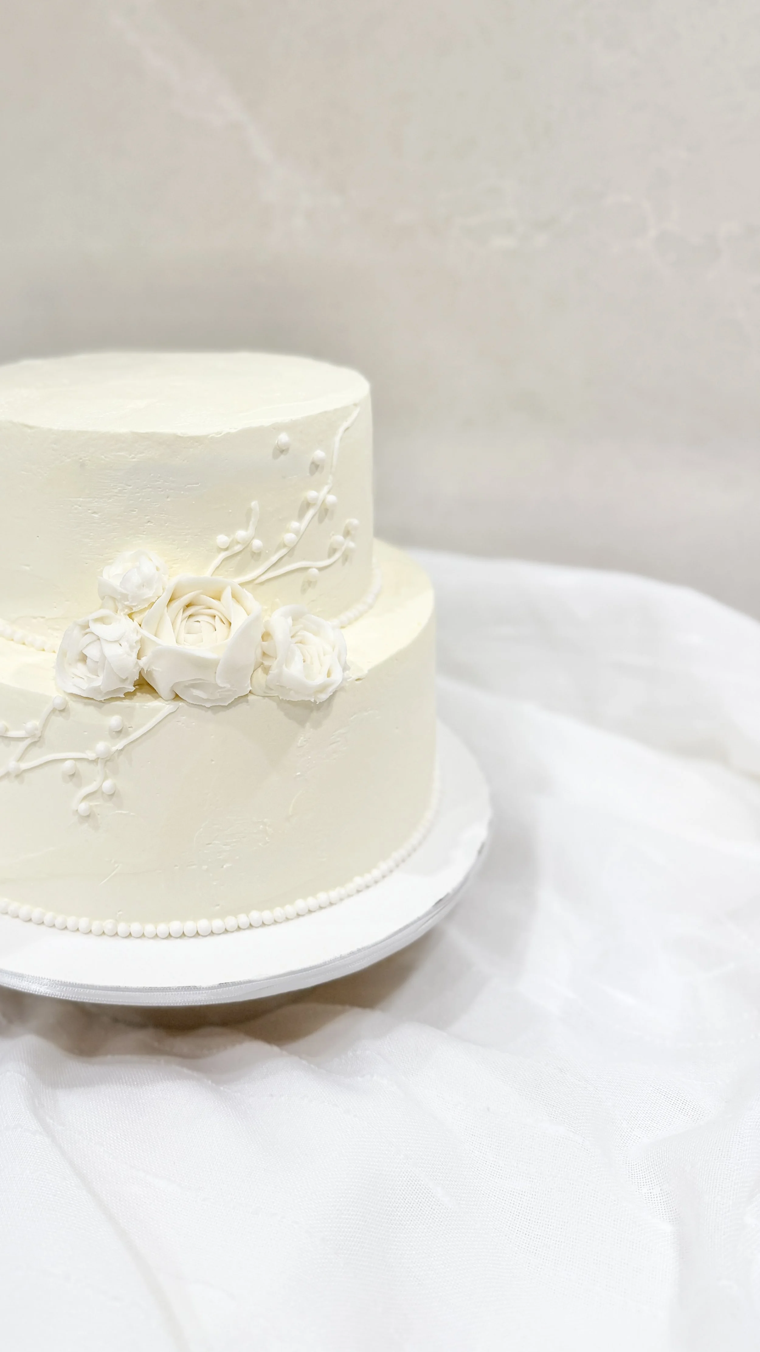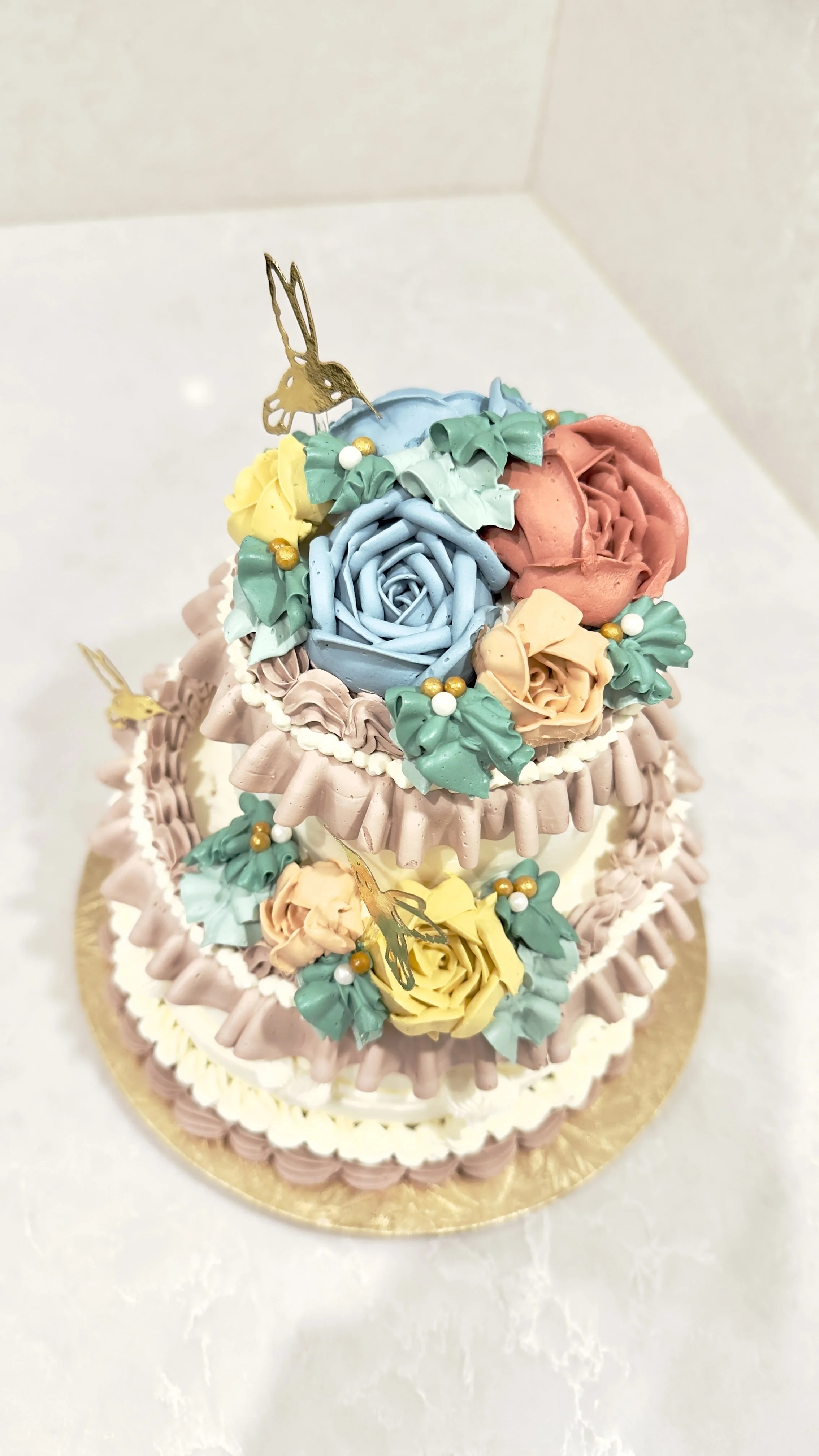 For special occasions such as weddings or events where the cake may need to sit out for extended periods, we use buttercream exclusively, as cakes with fresh cream must be refrigerated.